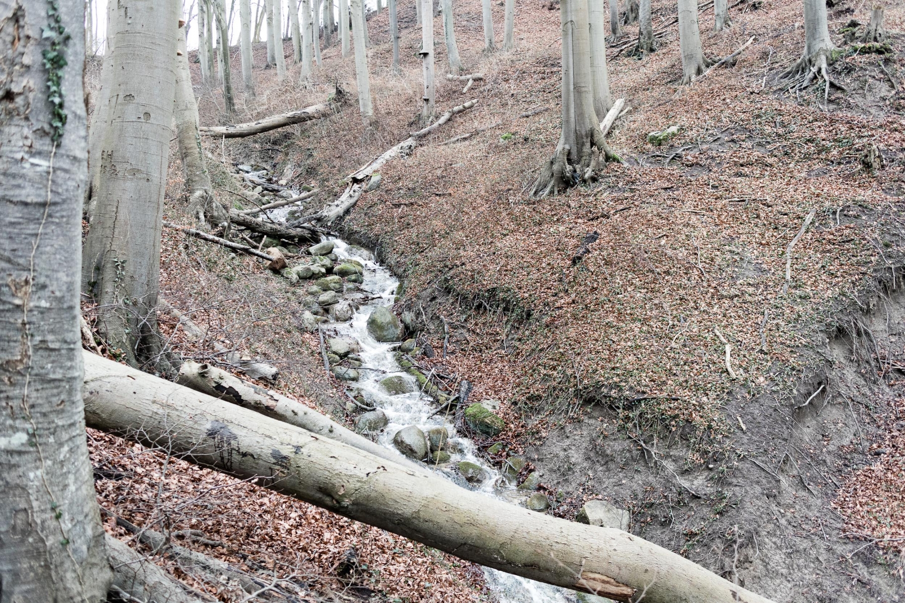 Rügen ist sehr hügelig und waldreich. In den stellenweise sehr feuchten Wäldern gibt es Sümpfe und viele kleine Rinnsale die einen Spaziergang auch im Winter spannend machen.